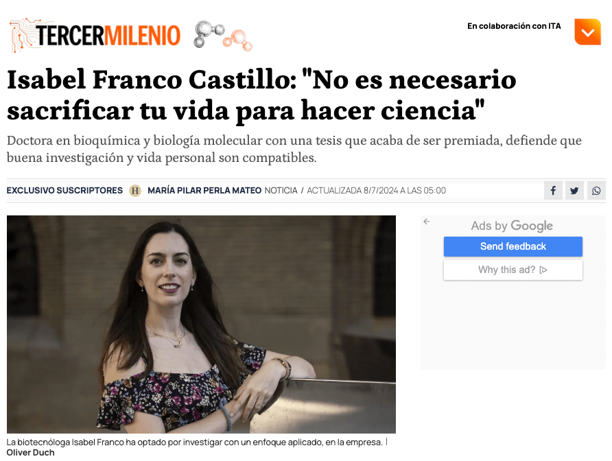 July 2024: Isabel was awarded one of four doctoral research prizes given by CSIC for her thesis “Preventing biodeterioration of cultural heritage using nanostructured materials”, under the supervision of Scott G. Mitchell y Jesús Martínez de la Fuente. Congratulations, Isa!