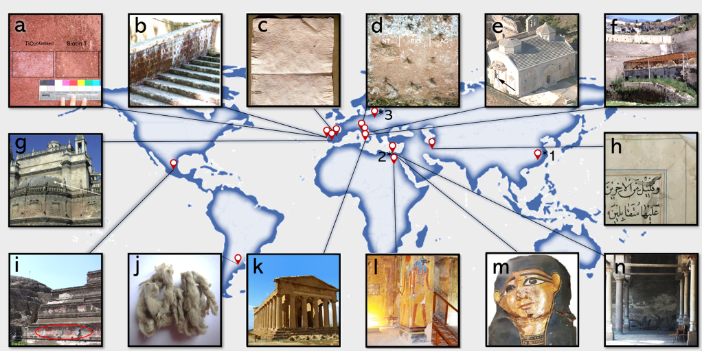 Constructing modular and highly processable nanomaterials offers a unique opportunity to produce precision biocides that meet the specific needs of cultural heritage conservation (e.g highly applicable colourless gels, waxes, sols etc.).5 We use comprehensive antimicrobial functional development programmes to assess the activity of these materials against bacterial and fungal strains commonly found infecting objects of cultural heritage. Ultimately the most active and applicable candidates are evaluated against biodeteriorative microorganism contaminants on paper, leather and stone surfaces in the laboratory as well as in real heritage objects from our collaborators.6,7,8